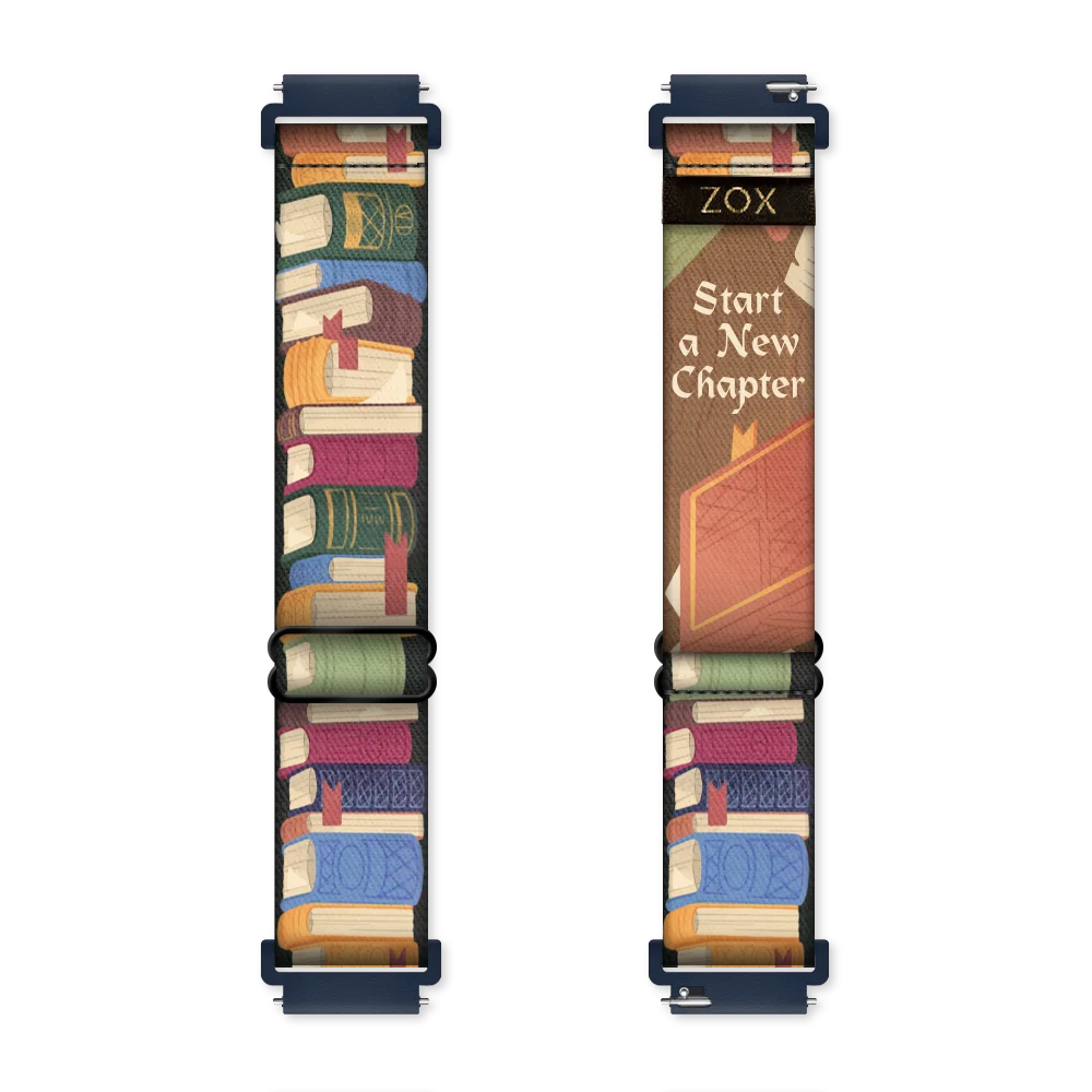 Watchband with muted colored books lining the book shelf. Inside reads Start A New Chapter.